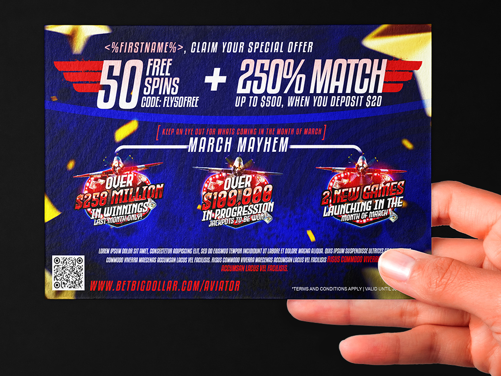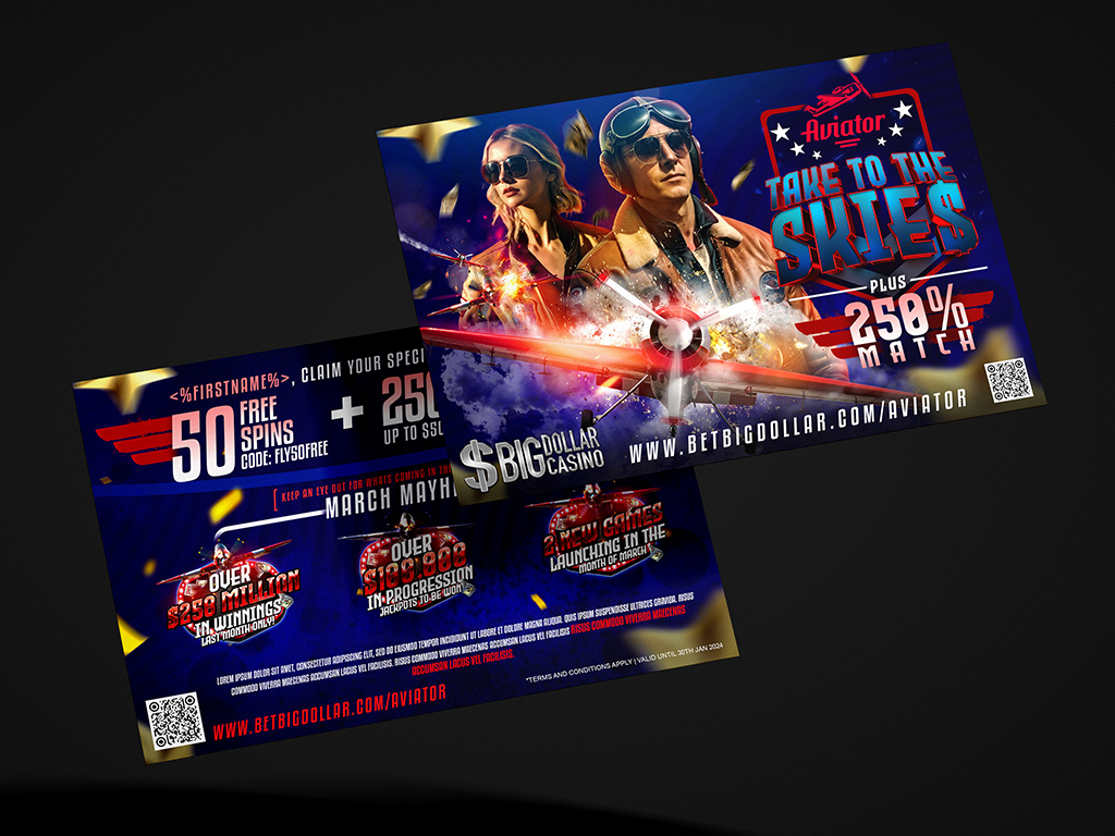 To support the launch of Aviator, a fast-paced online casino game, I designed a high-impact direct mailer aimed at driving player engagement and boosting deposits. The objective was to create a visually compelling piece that conveyed the adrenaline-fueled excitement of the game while delivering a clear promotional message.